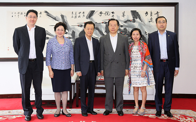 世茂國際總裁許薇薇、華通資本有限公司管理合伙人袁浩;集團鄭江副總會計師參加會見。(集團辦公廳)