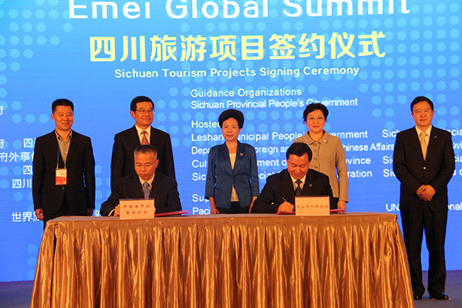在簽約儀式上,港中投總經(jīng)理許慕韓與樂山市張彤市長簽訂了「關于合作開發(fā)樂山市、峨眉山市旅游資源的戰(zhàn)略合作協(xié)定」。姜巖總經(jīng)理與四川省黃彥蓉副省長、省旅游局郝康理局長和樂山市委唐堅書記作為證簽人見證了雙方協(xié)議的簽署。