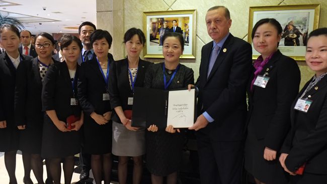 9月5日下午,土耳其總統(tǒng)埃爾多安離開酒店前,對杭州維景的服務(wù)深表滿意,在眾多媒體的關(guān)注下,為杭州維景簽名留念,并與管理人員合影,感謝杭州維景提供的溫馨、細(xì)致、周到的服務(wù),同時(shí)盛情邀請酒店員工去土耳其觀光游覽。