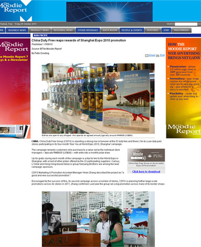 “精彩購物世博游”促銷活動受到全球免稅權威雜志穆迪報告(The Moddie Report)關注,并以專訪形式在慕迪報告網(wǎng)站和雜志上刊登了專題報道。