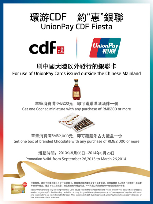 刷中國大陸以外發(fā)行的銀聯(lián)卡,單筆消費滿200元,即可獲贈品牌洋酒酒伴一個;單筆消費滿2000元,即可獲贈品牌巧克力禮盒一份。