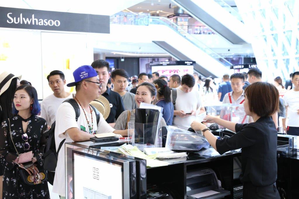 黃金周期間,免稅城內(nèi)人頭攢動,顧客如織,購物氣氛熱烈,消費熱情高漲,免稅城一線銷售人員取消休假,全部上崗,耐心地為每一位顧客提供專業(yè)、熱情的服務(wù)。店內(nèi)外增加安防人員,及時疏導(dǎo)客流,排隊現(xiàn)象比往年大為減少,店內(nèi)外秩序井然有序。