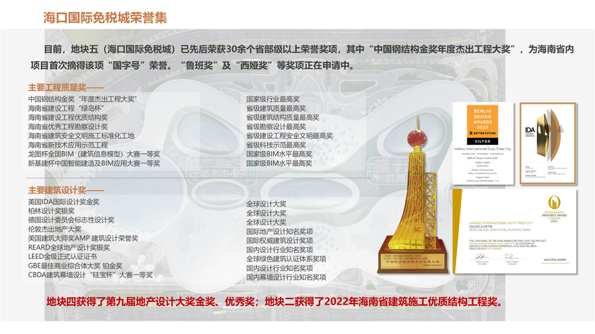 ▲ ??趪H免稅城項目整體建設(shè)所獲榮譽