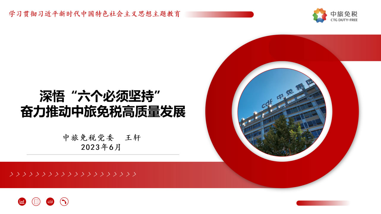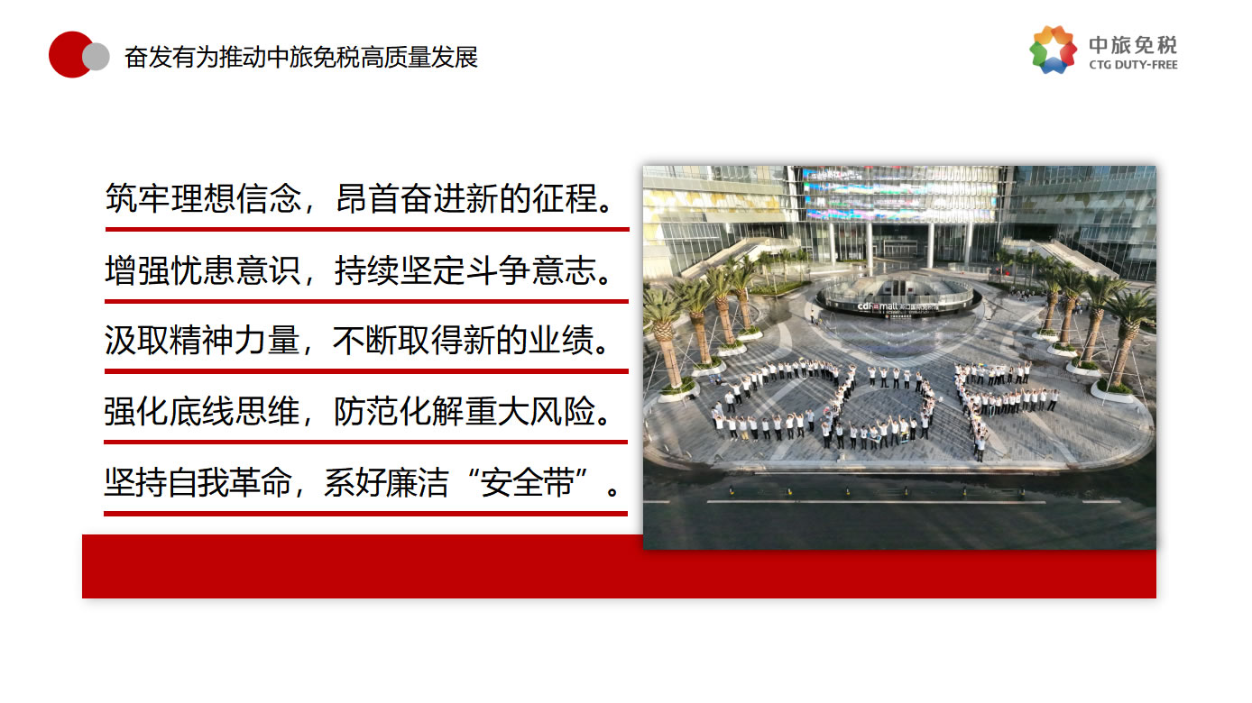 一是筑牢理想信念,昂首奮進新的征程。要堅決貫徹落實總書記指示,優(yōu)化發(fā)展方式,注重發(fā)展品質(zhì),追求質(zhì)量更優(yōu)、效益更好、效率更高的可持續(xù)增長,做強做優(yōu)公司核心競爭優(yōu)勢,全面提升公司經(jīng)營發(fā)展的系統(tǒng)能力。二是增強憂患意識,持續(xù)堅定斗爭意志。要進一步強化危機意識、憂患意識,主動擔(dān)責(zé)、主動擔(dān)難、主動擔(dān)險,以強烈的使命感和責(zé)任感,統(tǒng)一思想、統(tǒng)一意志、統(tǒng)一行動。三是汲取精神力量,不斷取得新的業(yè)績。要以“紅色引擎 免稅先鋒”“海棠精神”“紅帆工程”等黨建品牌活動為切入點,進一步提升基層黨組織的組織力,通過共建活動平臺、分享工作資源、交流工作經(jīng)驗、解決實際問題等途徑,實現(xiàn)黨的建設(shè)與業(yè)務(wù)發(fā)展建設(shè)良性互動,以深入推進全面從嚴治黨引領(lǐng)保障高質(zhì)量發(fā)展。四是強化底線思維,防范化解重大風(fēng)險。要深刻領(lǐng)會習(xí)近平總書記關(guān)于強化底線思維,防范化解重大風(fēng)險的重要論述,充分認清當(dāng)前面臨的形勢任務(wù),系統(tǒng)梳理查找存在的突出風(fēng)險問題,自覺從習(xí)近平新時代中國特色社會主義思想中找到破解矛盾問題的鑰匙,努力在新思想指引下探索推動高質(zhì)量發(fā)展的路徑。五是堅持自我革命,系好廉潔的“安全帶”。要繼續(xù)發(fā)揚自我革命精神,縱深推進黨風(fēng)廉政建設(shè)和反腐敗斗爭,一體推進“不敢腐、不能腐、不想腐”,圍繞財經(jīng)領(lǐng)域?qū)m椪蔚戎攸c問題、緊盯海南地區(qū)所屬的重點企業(yè)和重點項目,以及防范離島免稅“套代購”、傳統(tǒng)渠道免稅店經(jīng)營風(fēng)險等重點領(lǐng)域和巡視整改等重點工作,深化標本兼治、系統(tǒng)治理,以新時代廉潔文化建設(shè),涵養(yǎng)求真務(wù)實、團結(jié)奮斗的中免風(fēng)貌。